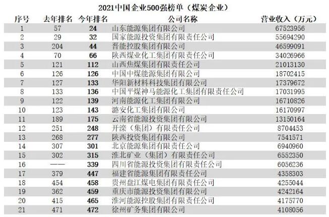 今年共有21家煤炭企業(yè)上榜。其中,山東能源集團有限公司、國家能源投資集團有限責(zé)任公司、晉能控股集團有限公司、陜西煤業(yè)化工集團有限責(zé)任公司入圍榜單前100名。四川省能源投資集團有限責(zé)任公司為新上榜企業(yè)。有8家企業(yè)排名較去年有所提升,11家企業(yè)排名下降,1家企業(yè)排名持平。