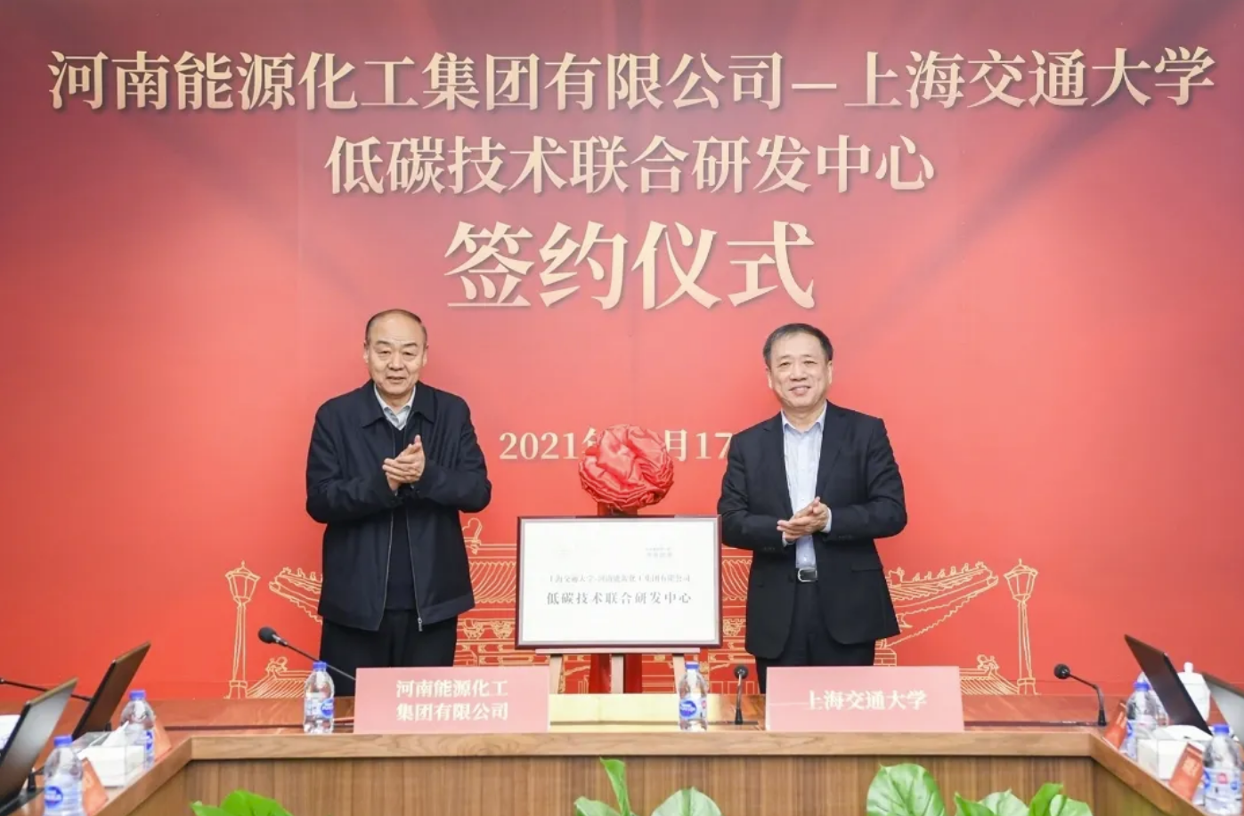 段志廣和朱新遠(yuǎn)分別代表雙方簽訂《河南能源化工集團(tuán)有限公司-上海交通大學(xué)低碳技術(shù)聯(lián)合研發(fā)中心合作協(xié)議》。