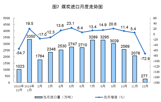 12月份,煤炭進(jìn)口量同比下降72.9%。2019年進(jìn)口煤炭3.0億噸,比上年增長6.3%。
