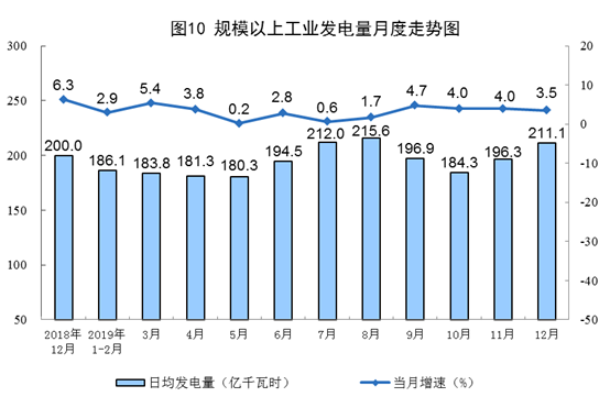 12月份,發(fā)電量6544億千瓦時(shí),同比增長3.5%,增速比上月回落0.5個(gè)百分點(diǎn);日均發(fā)電量211.1億千瓦時(shí),環(huán)比增加14.8億千瓦時(shí)。2019年發(fā)電量71422億千瓦時(shí),比上年增長3.5%。