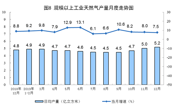 12月份,天然氣產(chǎn)量160億立方米,同比增長7.5%,增速比上月回落0.5個(gè)百分點(diǎn);日產(chǎn)5.2億立方米,環(huán)比增加0.2億立方米。2019年,天然氣產(chǎn)量1736億立方米,比上年增長9.8%。