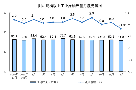 12月份,原油產(chǎn)量1606萬噸,同比下降1.9%,上月為增長0.9%;日均產(chǎn)量51.8萬噸,環(huán)比減少0.5萬噸。2019年國內(nèi)主要油田穩(wěn)產(chǎn)增產(chǎn)態(tài)勢(shì)良好,原油產(chǎn)量1.9億噸,比上年增長0.8%,扭轉(zhuǎn)了2016以來連續(xù)下滑的態(tài)勢(shì)。