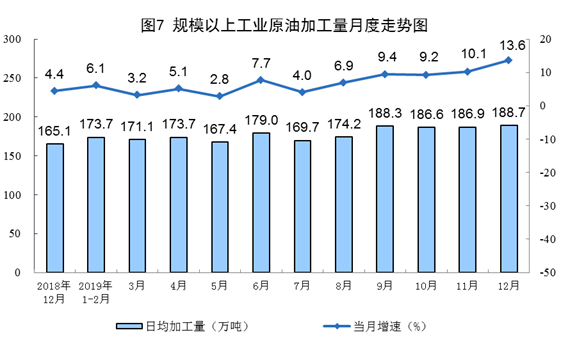 12月份,原油加工量5851萬噸,同比增長13.6%,增速比上月加快3.5個(gè)百分點(diǎn);日均加工188.7萬噸,環(huán)比增加1.8萬噸。2019年,受新增煉油產(chǎn)能持續(xù)釋放影響,原油加工量繼續(xù)較快增長,加工原油6.5億噸,比上年增長7.6%。