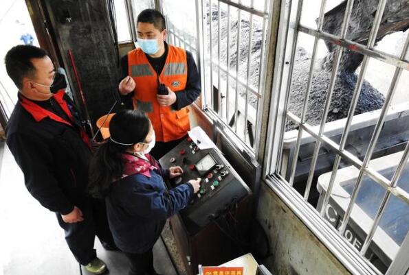 2020年3月5日,在四川省達(dá)州市達(dá)竹礦務(wù)局,工作人員(女)在操作機(jī)械設(shè)備為“達(dá)州直達(dá)武昌10小時(shí)精煤專(zhuān)列”裝運(yùn)精煤。