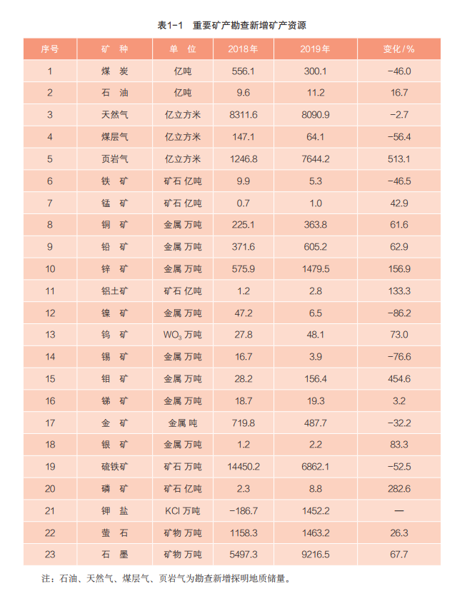 2019年,石油新增探明地質(zhì)儲(chǔ)量11.2億噸,其中,新增探明技術(shù)可采儲(chǔ)量1.6億噸。頁(yè)巖氣新增探明地質(zhì)儲(chǔ)量 7644.2 億立方米,其中,新增探明技術(shù)可采儲(chǔ)量 1838.4 億立方米。煤炭新增300.1億噸,較上年明顯下降。主要金屬礦產(chǎn)中錳礦、銅礦、鉛礦、鋅礦、鎢礦、鉬礦、銀礦等新增明顯,鐵礦、鎳礦、錫礦、金礦明顯下降。非金屬礦產(chǎn)中磷礦、石墨明顯增長(zhǎng)。