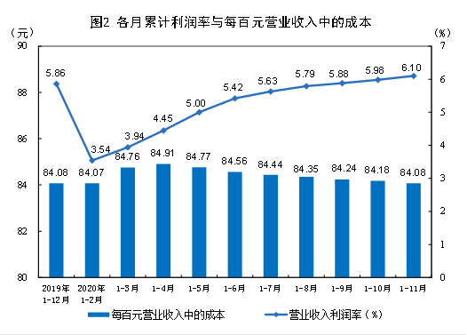 1—11月份,規(guī)模以上工業(yè)企業(yè)每百元營(yíng)業(yè)收入中的成本為84.08元,同比減少0.01元;每百元營(yíng)業(yè)收入中的費(fèi)用為8.92元,同比增加0.12元。