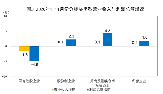 1—11月份,規(guī)模以上工業(yè)企業(yè)中,國(guó)有控股企業(yè)實(shí)現(xiàn)利潤(rùn)總額14456.9億元,同比下降4.9%;股份制企業(yè)實(shí)現(xiàn)利潤(rùn)總額40580.1億元,增長(zhǎng)2.3%;外商及港澳臺(tái)商投資企業(yè)實(shí)現(xiàn)利潤(rùn)總額16105.2億元,增長(zhǎng)4.3%;私營(yíng)企業(yè)實(shí)現(xiàn)利潤(rùn)總額17332.2億元,增長(zhǎng)1.8%。
