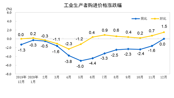 2020年12月份,全國工業(yè)生產(chǎn)者出廠價格同比下降0.4%,環(huán)比上漲1.1%;工業(yè)生產(chǎn)者購進價格同比持平,環(huán)比上漲1.5%。2020年全年,工業(yè)生產(chǎn)者出廠價格比上年下降1.8%,工業(yè)生產(chǎn)者購進價格下降2.3%。