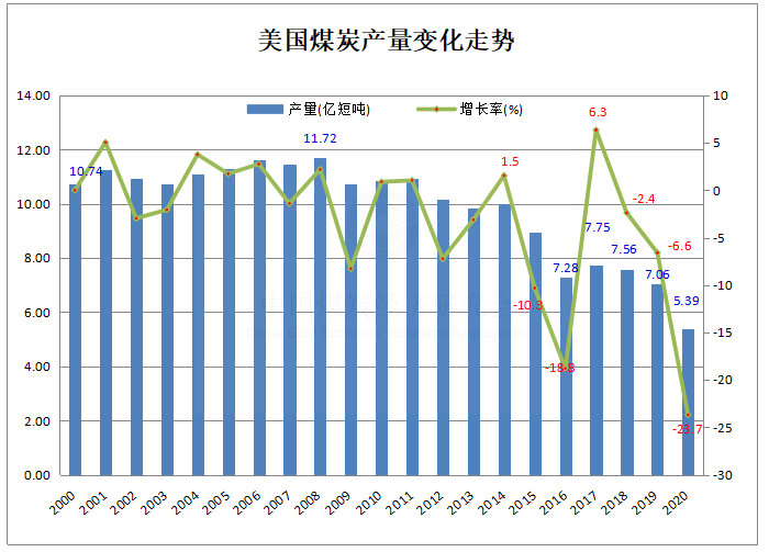 另據(jù)上月末美國能源信息署(EIA)發(fā)布的能源論評( Monthly Energy Review)報告數(shù)據(jù)顯示,2020年美國煤炭產(chǎn)量為5.39億短噸(約合4.89億噸),首次跌破5億噸,同比減少1.67億短噸,下降23.7%。其中,12月份煤炭產(chǎn)量4643.6萬短噸,同比下降12.7%。