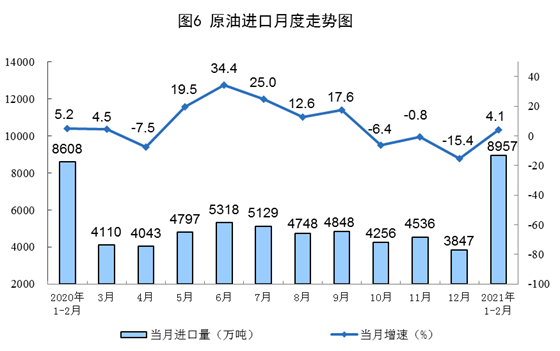 原油生產(chǎn)同比保持穩(wěn)定增長(zhǎng),日均環(huán)比增產(chǎn)。1—2月份,生產(chǎn)原油3208萬(wàn)噸,同比增長(zhǎng)0.4%,比2019年1—2月份增長(zhǎng)4.1%,兩年平均增長(zhǎng)2.0%;日均產(chǎn)量54.4萬(wàn)噸,比上年12月份增加1.9萬(wàn)噸。加工原油11424萬(wàn)噸,同比增長(zhǎng)15.0%,比2019年1—2月份增長(zhǎng)10.6%,兩年平均增長(zhǎng)5.2%;日均加工193.6萬(wàn)噸,比上年12月份增加0.1萬(wàn)噸。