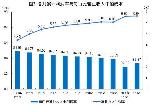 1—3月份,規(guī)模以上工業(yè)企業(yè)實現(xiàn)營業(yè)收入27.48萬億元,同比增長38.7%;發(fā)生營業(yè)成本22.91萬億元,增長36.5%;營業(yè)收入利潤率為6.64%,同比提高2.76個百分點。