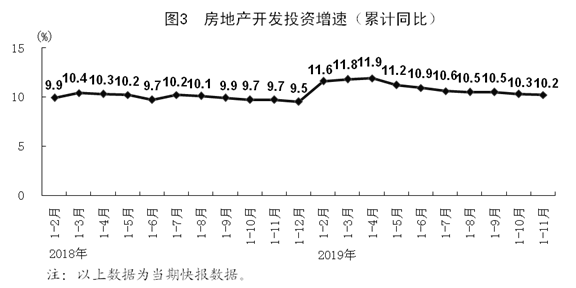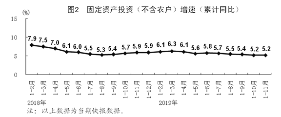 1-11月份,全國固定資產投資(不含農戶)533718億元,同比增長5.2%,增速與1-10月份持平。分領域看,基礎設施投資同比增長4.0%,制造業(yè)投資增長2.5%,房地產開發(fā)投資增長10.2%。全國商品房銷售面積148905萬平方米,同比增長0.2%;商品房銷售額139006億元,增長7.3%。分產業(yè)看,第一產業(yè)投資下降0.1%,第二產業(yè)投資增長2.4%,第三產業(yè)投資增長6.7%。民間投資303786億元,增長4.5%。1-11月份,高技術產業(yè)投資同比增長14.1%,快于全部投資8.9個百分點,其中高技術制造業(yè)和高技術服務業(yè)投資同比分別增長14.8%和13.1%。社會領域投資同比增長12.6%,快于全部投資7.4個百分點,其中教育,文化、體育和娛樂業(yè)投資分別增長17.5%和13.4%。生態(tài)保護和環(huán)境治理業(yè)、環(huán)境監(jiān)測及治理服務投資同比分別增長36.3%、30.6%,分別快于全部投資31.1、25.4個百分點。