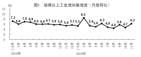 11月份,全國規(guī)模以上工業(yè)增加值同比增長6.2%,增速比上月加快1.5個百分點。1-11月份,全國規(guī)模以上工業(yè)增加值增長5.6%,增速與1-10月份持平。分經濟類型看,11月份,國有控股企業(yè)增加值增長3.7%;股份制企業(yè)增長7.0%,外商及港澳臺商投資企業(yè)增長3.2%;私營企業(yè)增長8.9%,增速比上月加快3.5個百分點。分三大門類看,采礦業(yè)增加值增長5.7%,制造業(yè)增長6.3%,電力、熱力、燃氣及水生產和供應業(yè)增長6.7%。高技術制造業(yè)、裝備制造業(yè)增加值分別增長8.9%、8.5%,分別比規(guī)模以上工業(yè)快2.7、2.3個百分點;其中醫(yī)療儀器設備及儀器儀表制造業(yè)、電子及通信設備制造業(yè)分別增長12.6%和10.8%,分別比規(guī)模以上工業(yè)快6.4和4.6個百分點。太陽能電池和集成電路產量分別增長23.0%和18.2%。汽車產量增長3.7%。制造業(yè)采購經理指數(PMI)分項指數中,生產指數、新訂單指數和供應商配送時間指數分別為52.6%、51.3%和50.5%,均高于臨界點且均比上月有所回升。制造業(yè)生產經營活動預期指數為54.9%,位于較高景氣區(qū)間。
