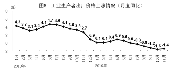 11月份,全國工業(yè)生產者出廠價格同比下降1.4%,降幅比上月收窄0.2個百分點,環(huán)比下降0.1%。工業(yè)生產者購進價格同比下降2.2%,環(huán)比下降0.1%。1-11月份,工業(yè)生產者出廠價格同比下降0.3%,工業(yè)生產者購進價格下降0.7%。