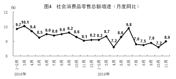 11月份,社會消費品零售總額38094億元,同比增長8.0%,增速比上月加快0.8個百分點。其中,扣除汽車以外的社會消費品零售總額增長9.1%。1-11月份,社會消費品零售總額372872億元,同比增長8.0%。按經營單位所在地分,11月份,城鎮(zhèn)消費品零售額32345億元,增長7.9%;鄉(xiāng)村消費品零售額5748億元,增長9.1%。按消費類型分,餐飲收入4964億元,增長9.7%;商品零售33130億元,增長7.8%。消費升級類商品較快增長。限額以上單位化妝品類、飲料類和通訊器材類商品分別增長16.8%、13.0%和12.1%,增速分別快于全部社會消費品零售總額8.8、5.0和4.1個百分點。